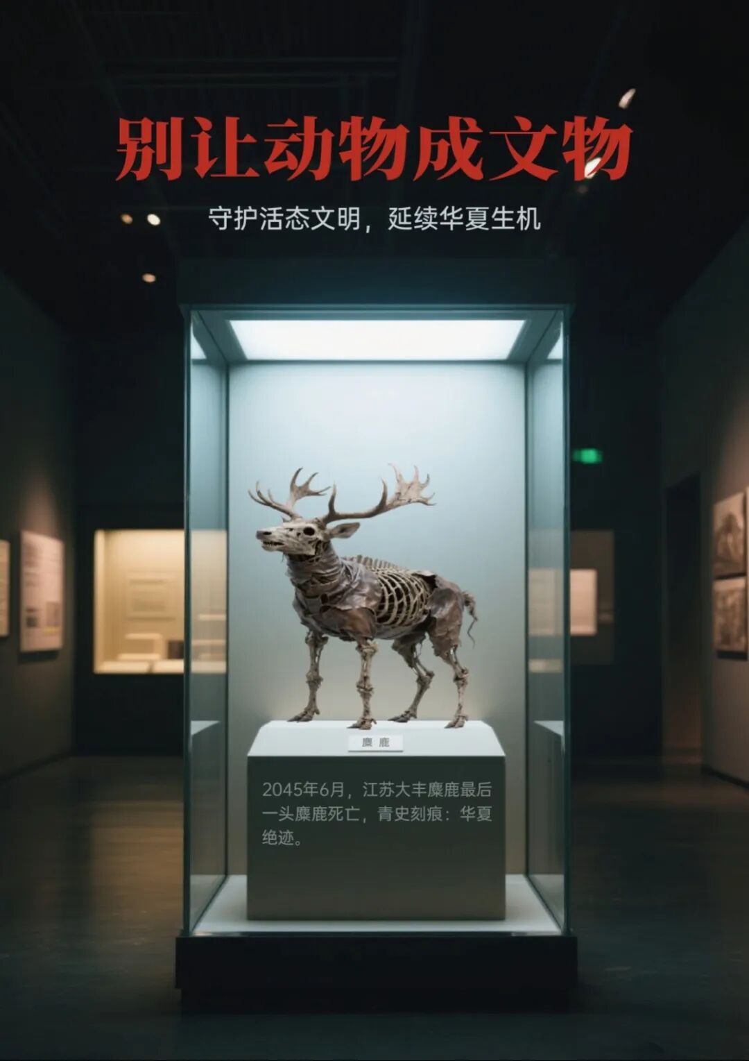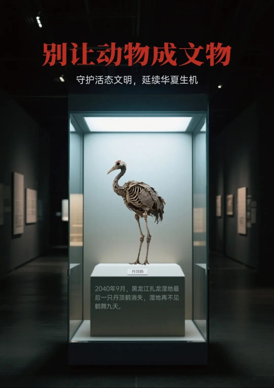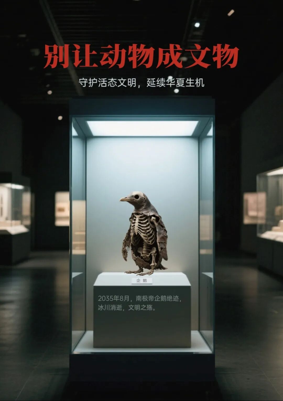 海报融合海陆空,以南极企鹅、黑龙江丹顶鹤、江苏麋鹿的风干标本为主体,陈列于冰冷展柜,标注因环境破坏而灭绝的时间。通过博物馆化的残酷预言,警示人类守护活态文明与自然共生,延续华夏生态文化血脉。
