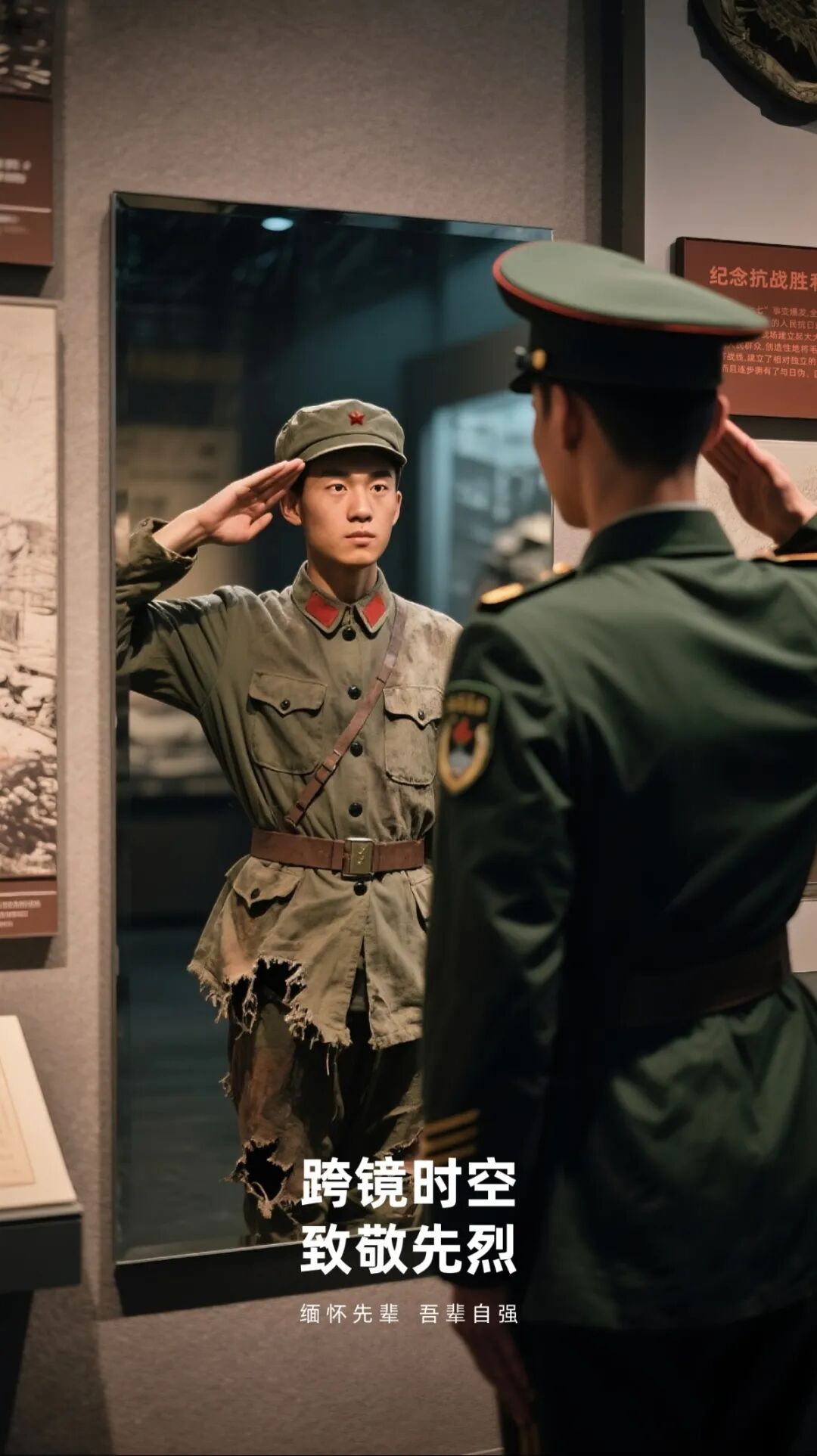 通过时空对话的形式,呈现现代军人在抗日战争纪念博物馆,面对镜子敬礼,镜子里面呈现的是和现代军人年龄相仿的八路军战士,军人与军人敬礼,跨时空对话。