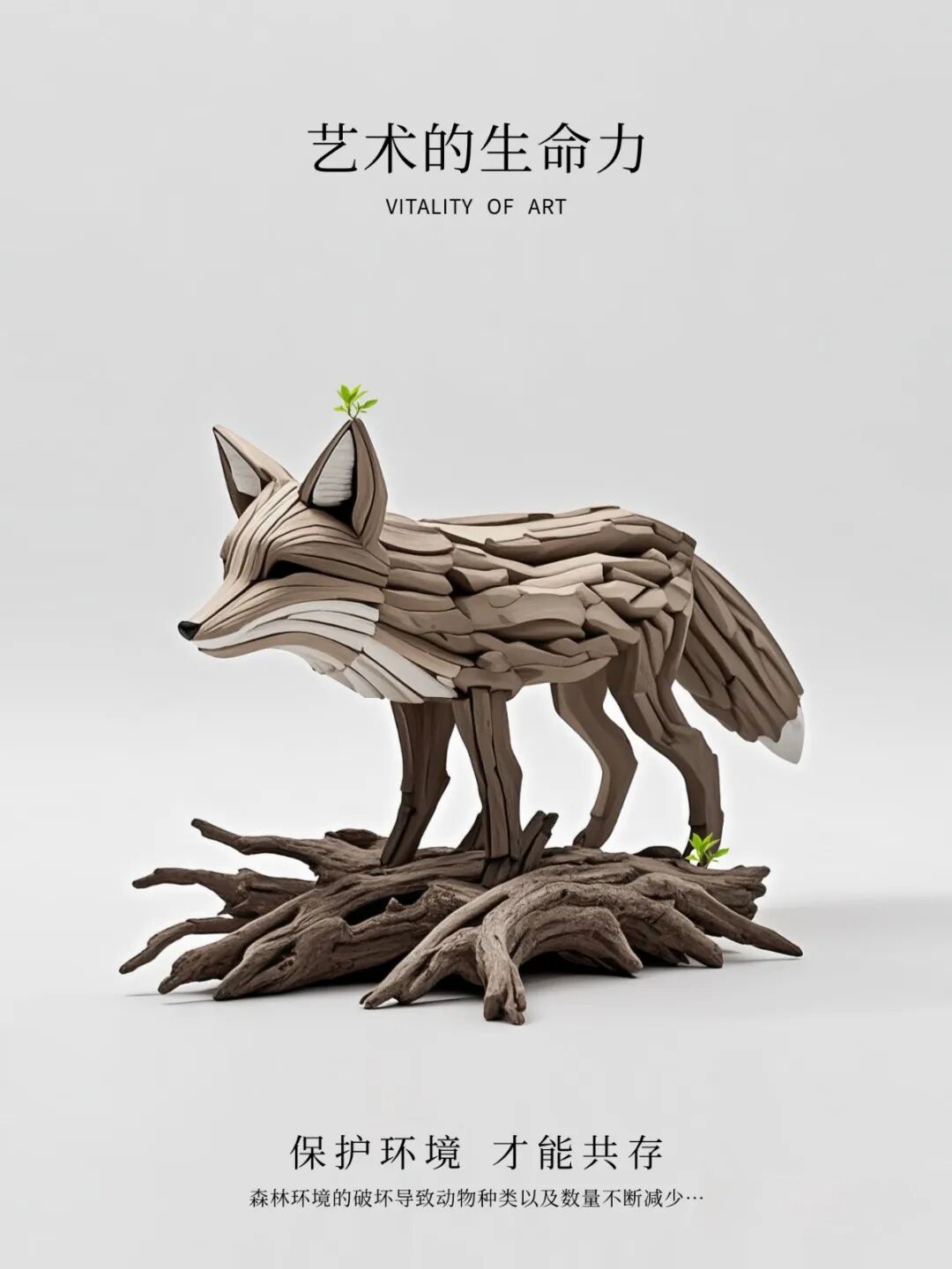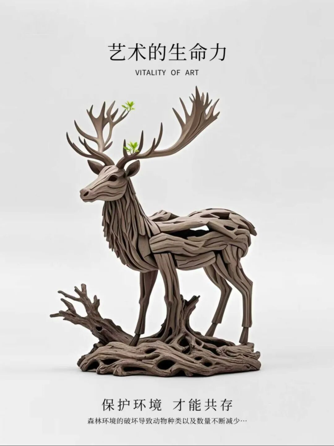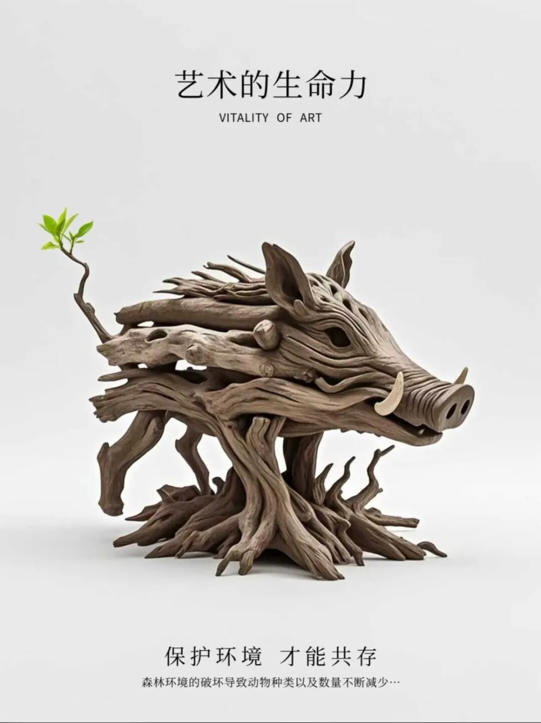 以枯木雕塑寓意森林景象,塑造野猪、小鹿、狐狸等枯木艺术系列,同时让枯木长新芽寓意枯木逢春,呼吁人类重视生态环境,告诉我们保护环境枯木亦逢春。