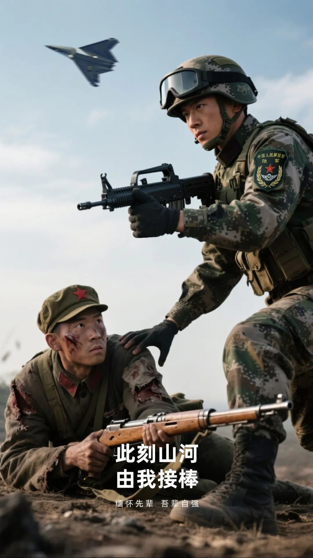 通过时空对话的形式,呈现现代军人在抗日战争纪念博物馆,面对镜子敬礼,镜子里面呈现的是和现代军人年龄相仿的八路军战士,军人与军人敬礼,跨时空对话。