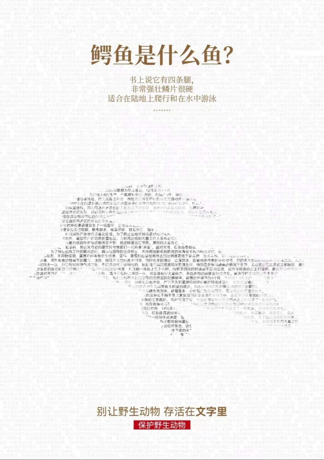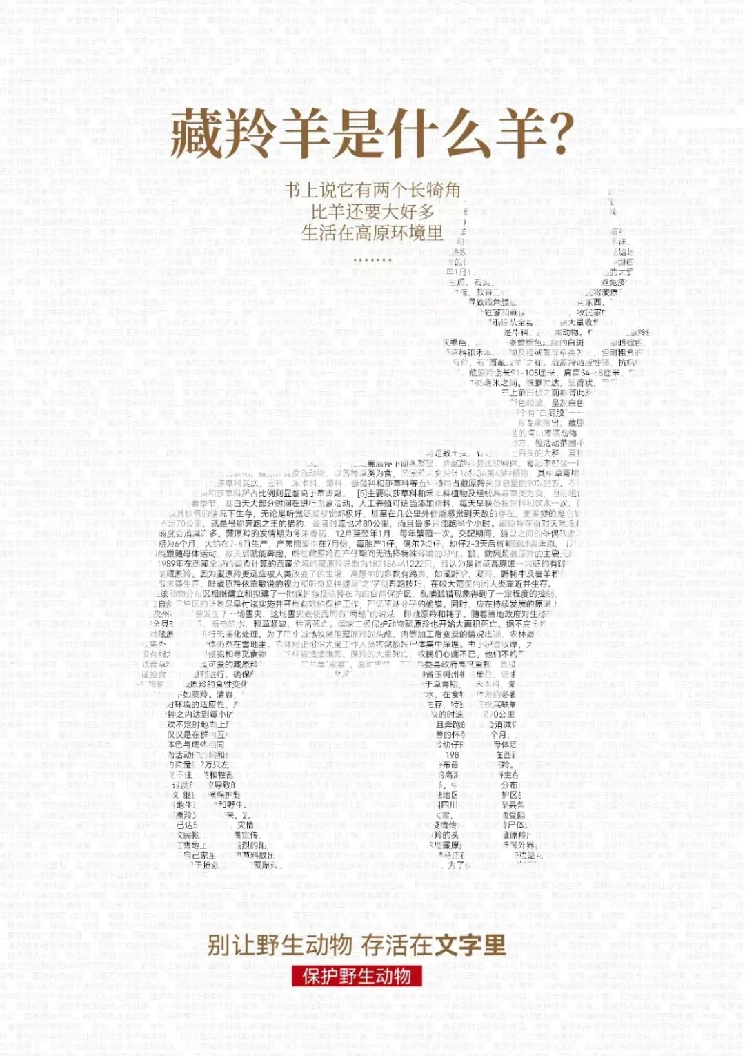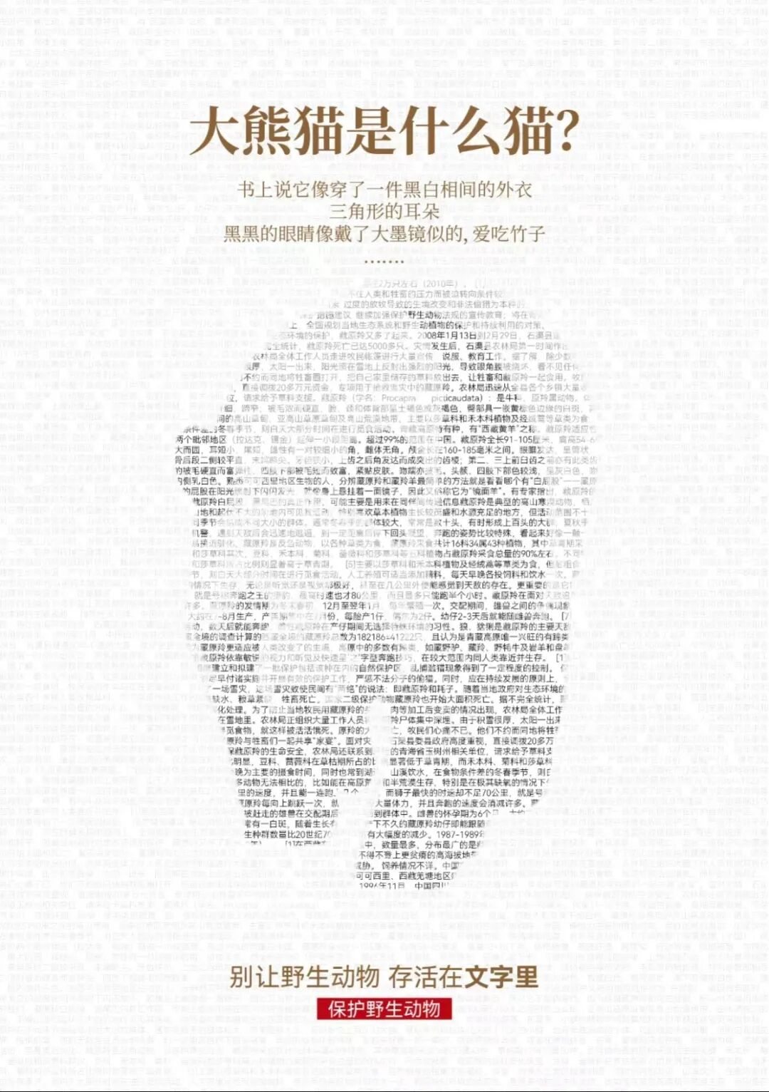 将羚羊、大熊猫、金丝猴等珍贵野生动物用文字融合组成剪影形式的文字密码,警示大家对动物的保护不仅是现在还有未来,前人栽树后人乘凉,不能让后代只通过文字了解野生动物。