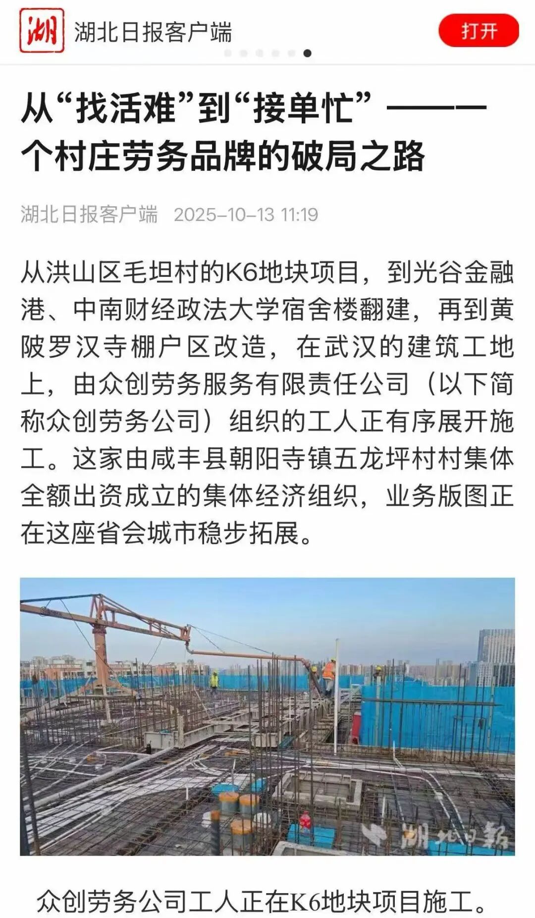 从洪山区毛坦村的K6地块项目,到光谷金融港、中南财经政法大学宿舍楼翻建,再到黄陂罗汉寺棚户区改造,在武汉的建筑工地上,由众创劳务服务有限责任公司(以下简称众创劳务公司)组织的工人正有序展开施工。这家由咸丰县朝阳寺镇五龙坪村村集体全额出资成立的集体经济组织,业务版图正在这座省会城市稳步拓展。